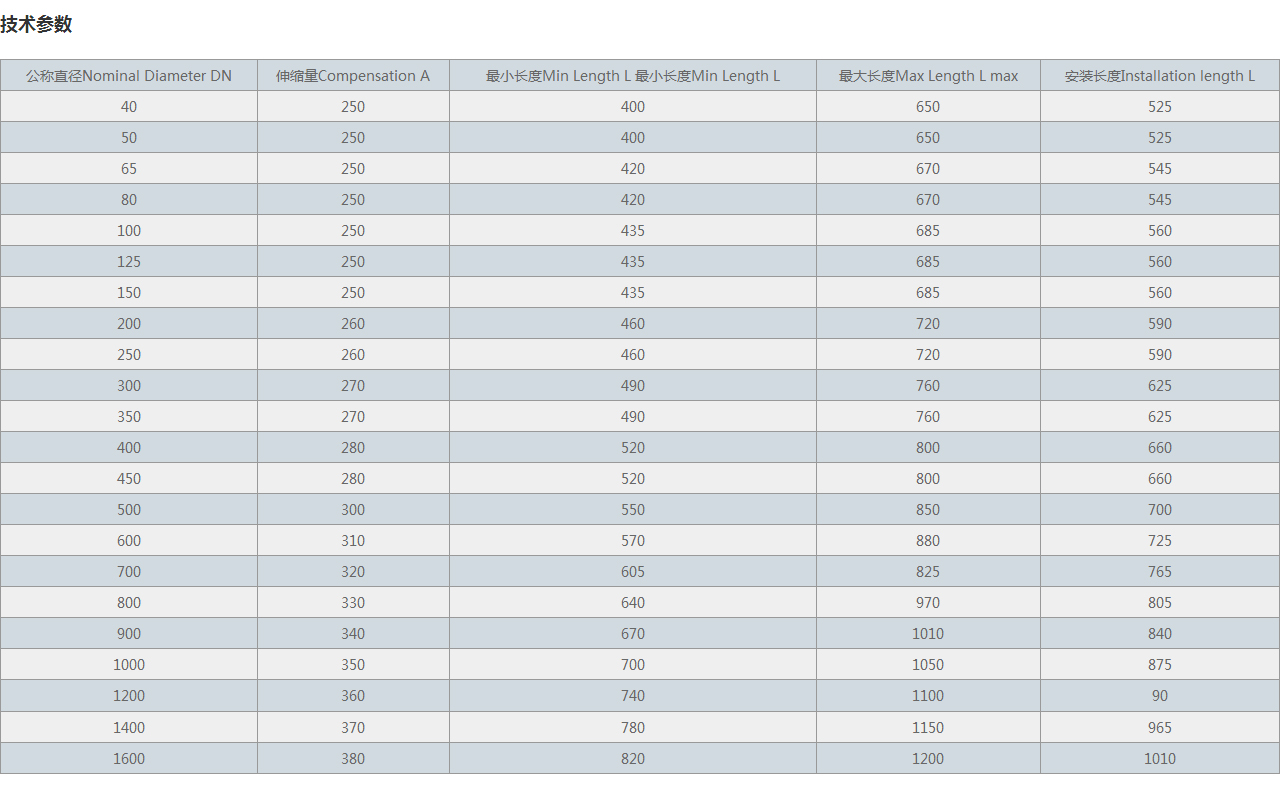 | 公稱直徑Nominal Diameter DN | 伸縮量Compensation A | 很小長度Min Length L 很小長度Min Length L | 很大長度Max Length L max | 安裝長度Installation length L |